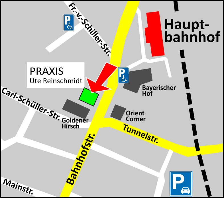 Die Praxis ist mit Bus und Bahn sehr gut zu erreichen. Der Bayreuther Hauptbahnhof ist nur ca. 100 Meter entfernt (ein bis zwei Minuten zu Fuß).